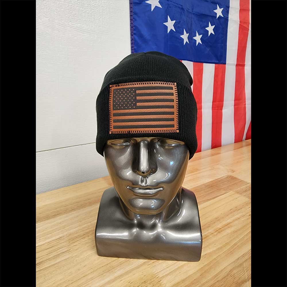 - Unisex Black Cuffed Beanies W/ American Flag Leather Patch