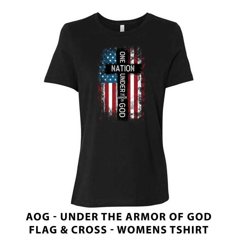 UNDER THE ARMOR OF GOD CROSS & FLAG T-SHIRT - BLACK - WOMENS